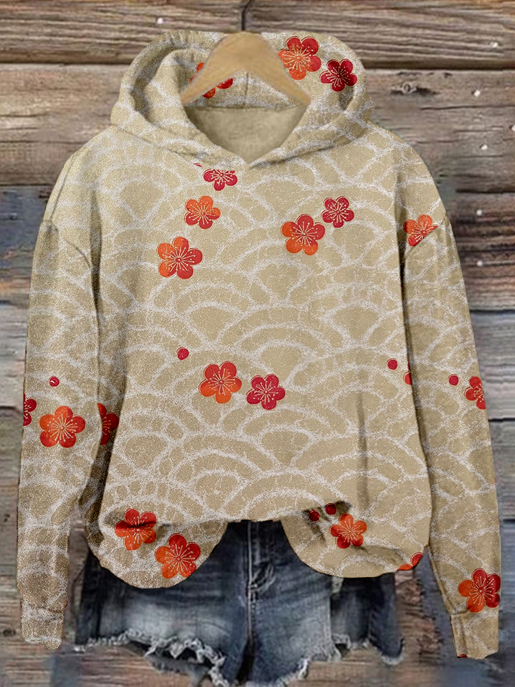 Plum Blossom & Wave Japanese Art Vintage Cozy Hoodie