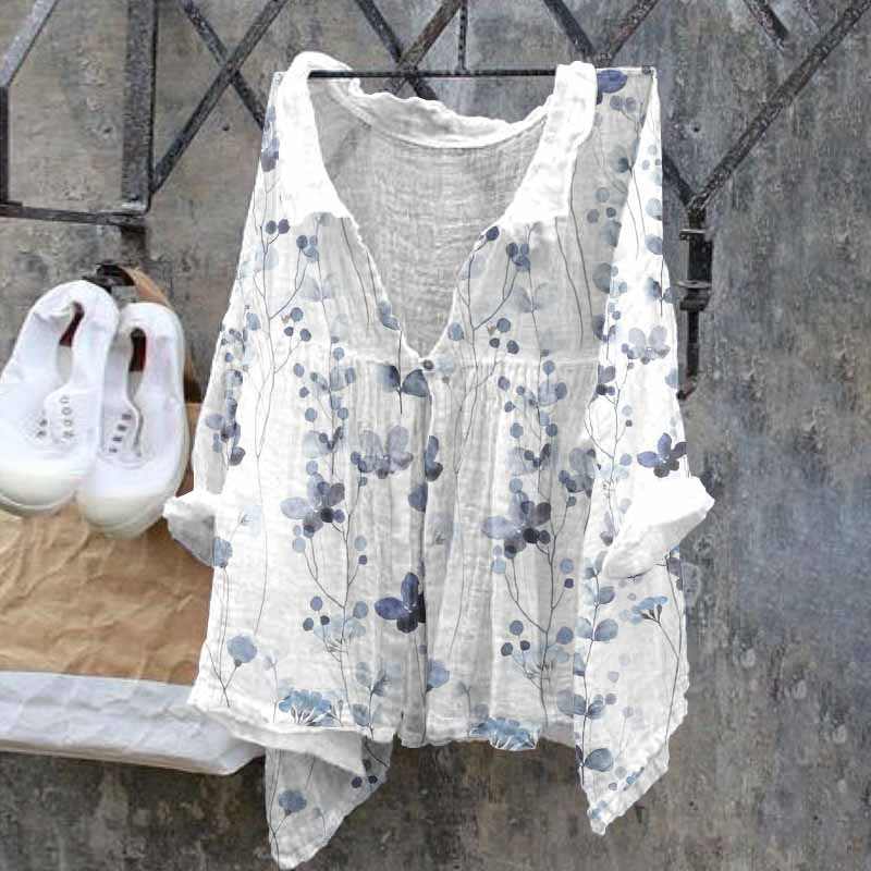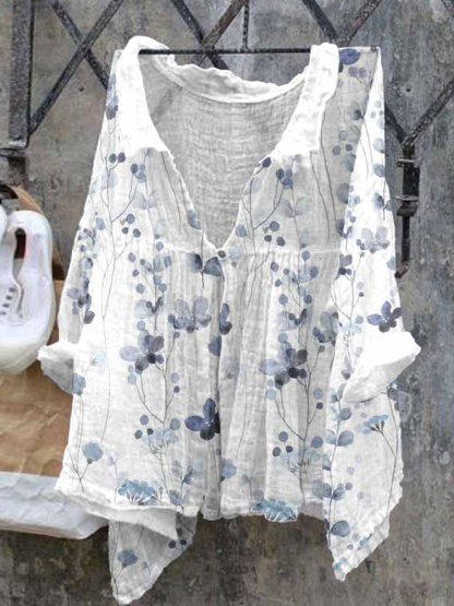 Retro Blue Floral Print Casual Cotton Linen Shirt