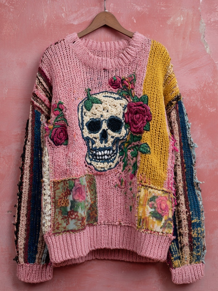 Retro Skull & Roses Embroidered Patchwork Knitted Sweater
