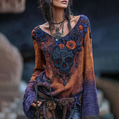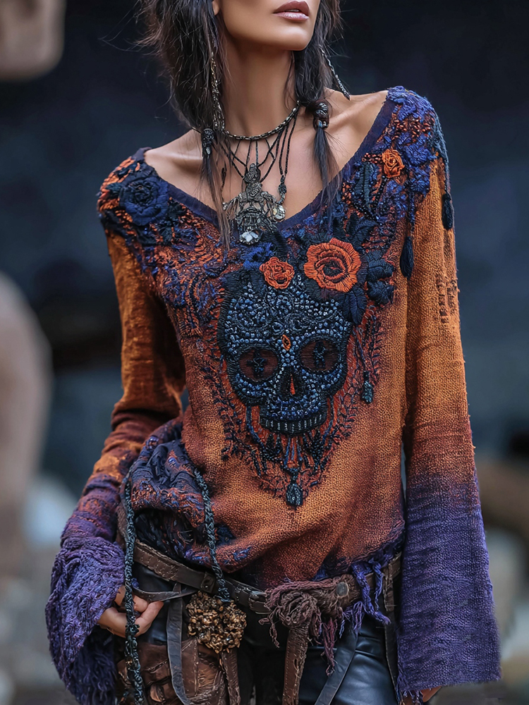 Rose Skull Rhinestone Contrast V Neck T-shirt