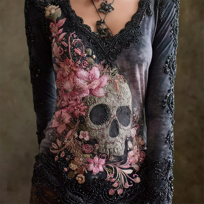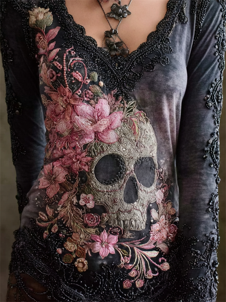 Skull & Pink Flowers Beaded V Neck Comfy T Shirt