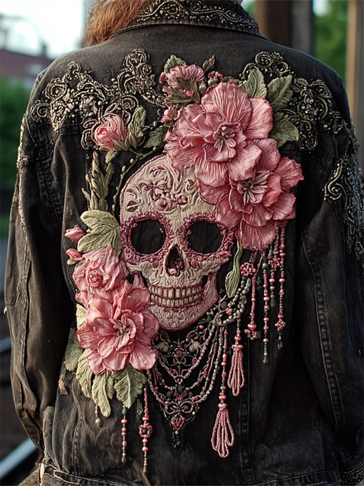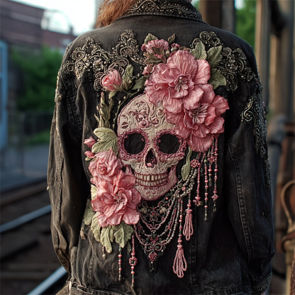 Sugar Skull Pink Flowers Beaded Washed Denim Jacket