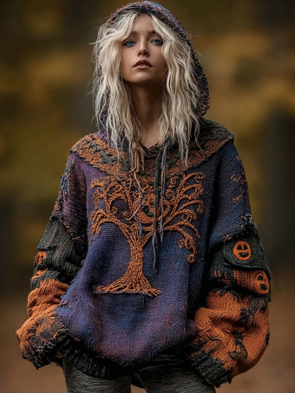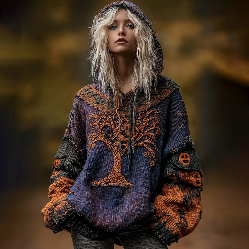 Tree Of Life Pumpkin Face Chunky Crochet Hooded Sweater