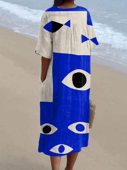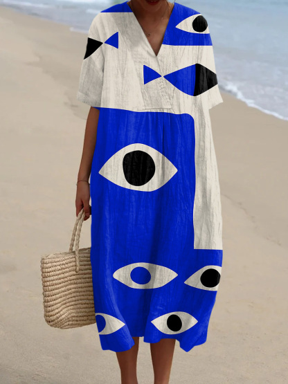 Vintage Abstract Eyes Art Print V-Neck Dress