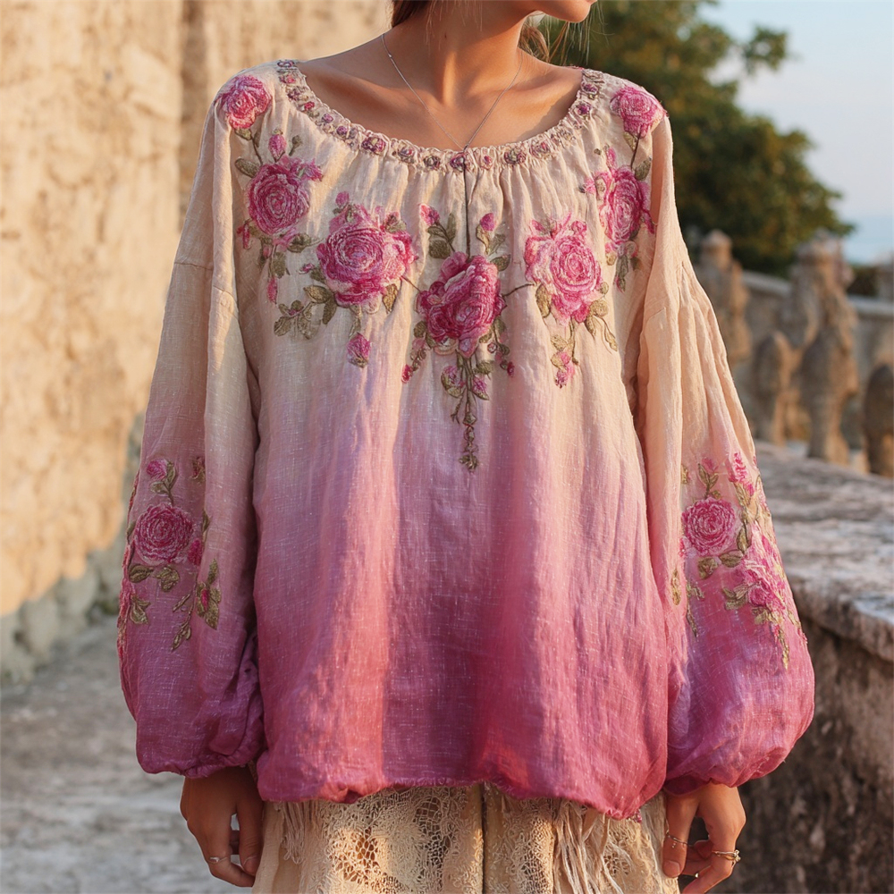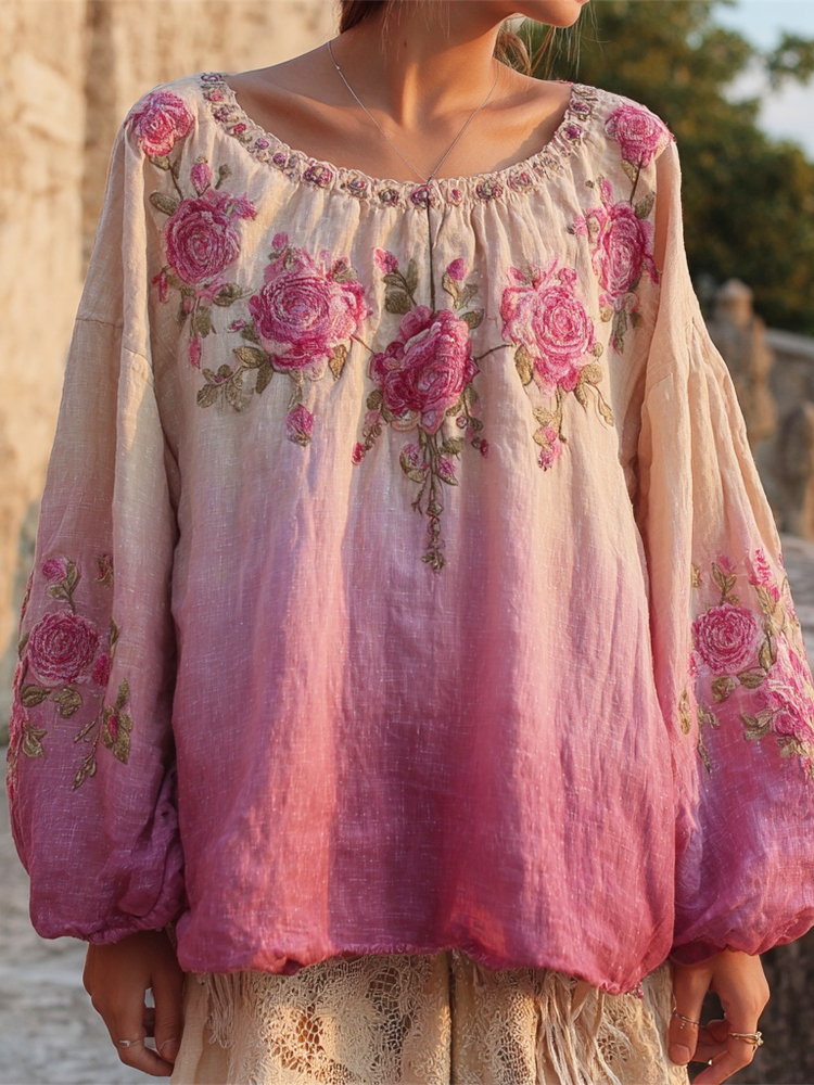Vintage Boho Floral Embroidery Women's Linen Loose Shirt