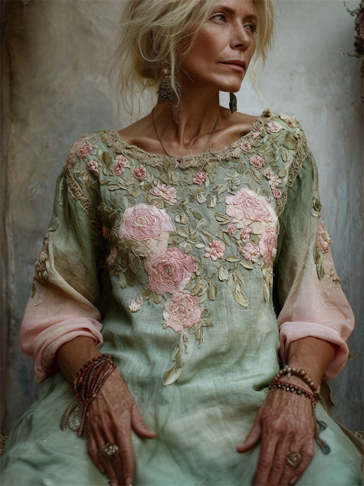 Vintage Forest Pink Roses Gradient Linen Maxi Dress