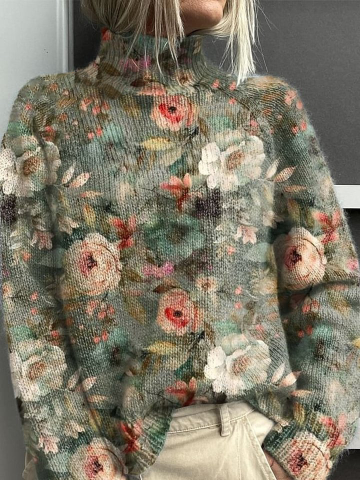 Vintage Green Flowers Print Knit Turtleneck Pullover Sweater