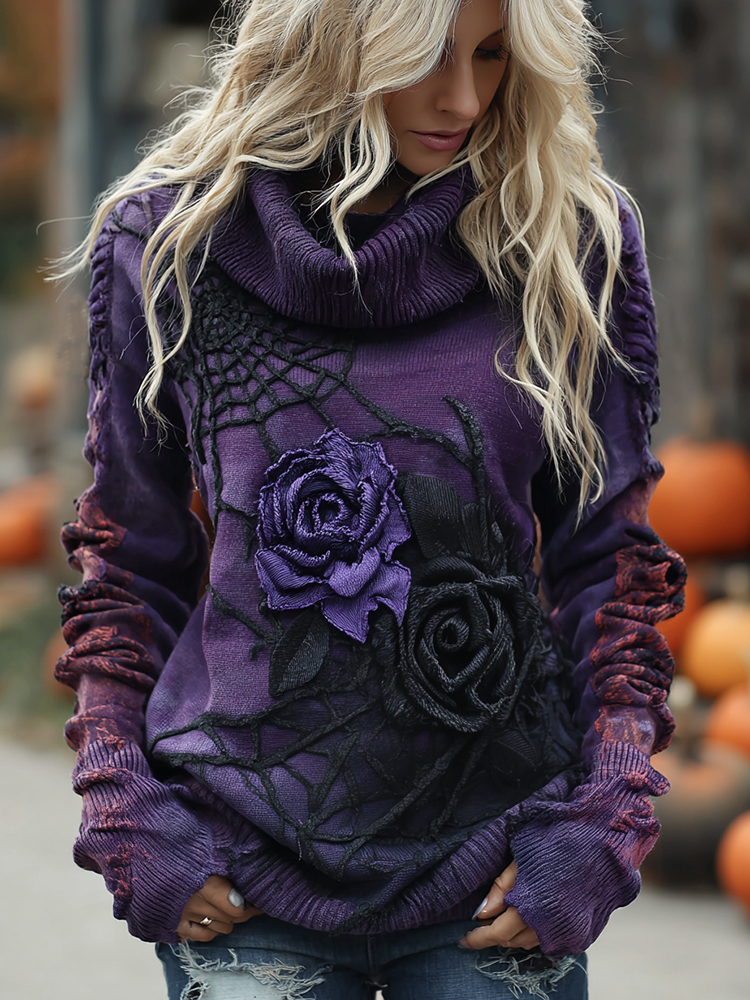 Vintage Halloween Black And Purple Rose Art Cozy Knit Turtleneck Sweater