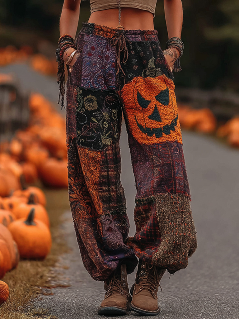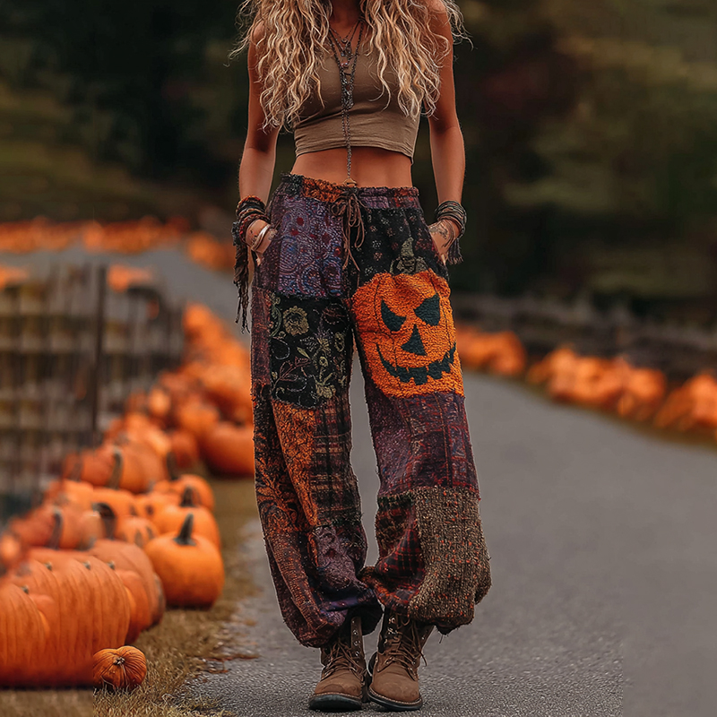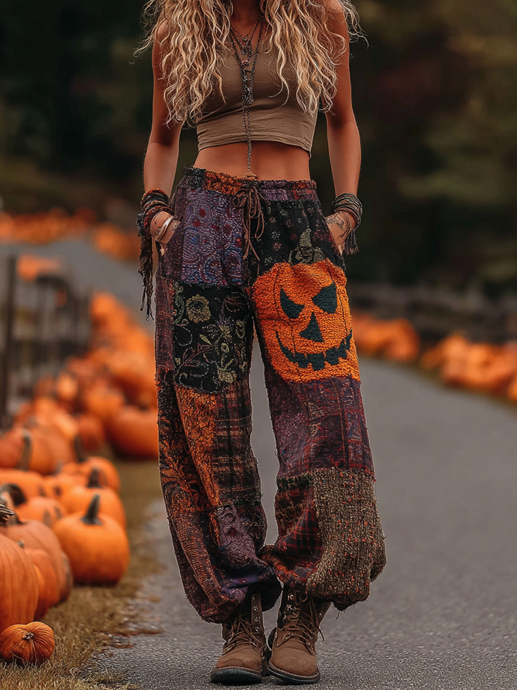 Vintage Halloween Themed Pumpkin Embroidered Linen Pants