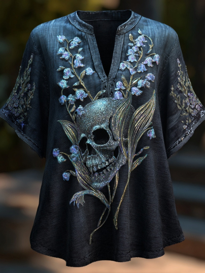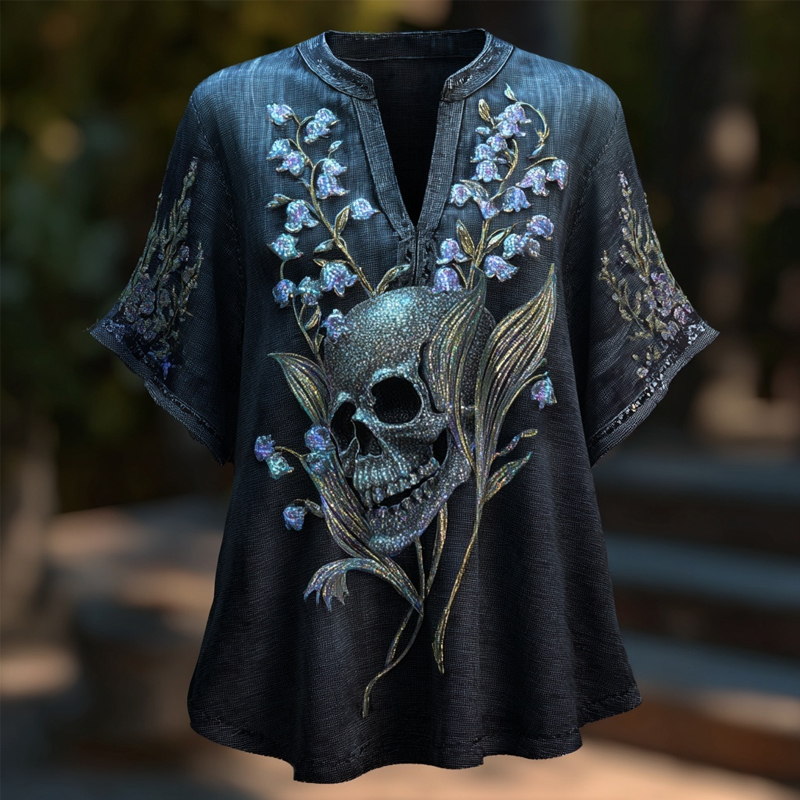 Vintage Lily Of The Valley Skull Embroidered Linen Tunic