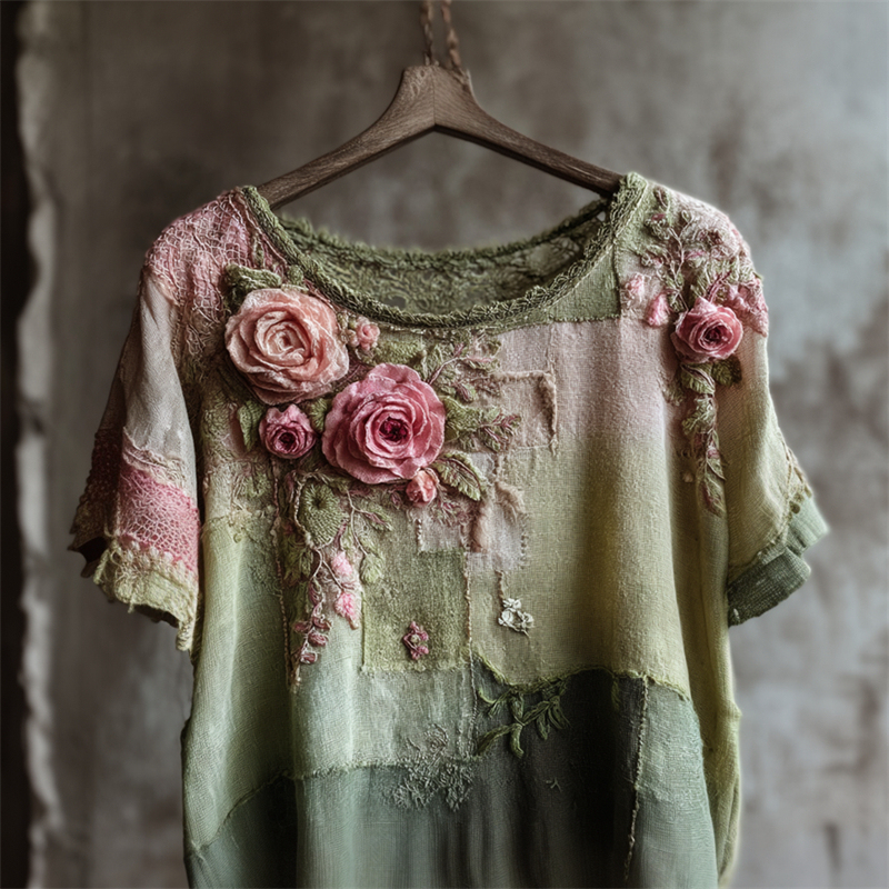 Vintage Pink Roses Cottage Patchwork Linen Tunic