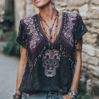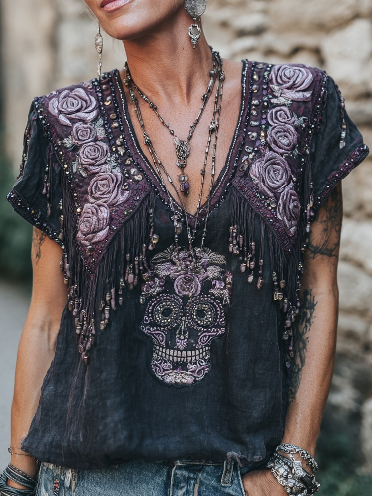 Vintage Purple Roses & Skull Embroidered V Neck Linen Shirt