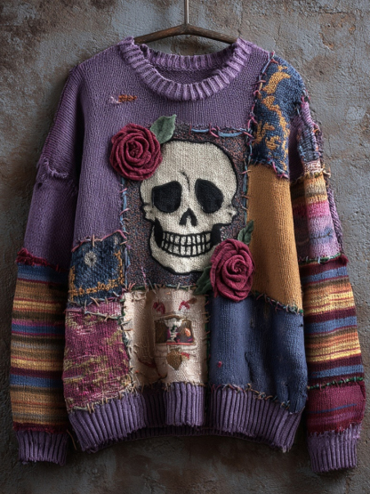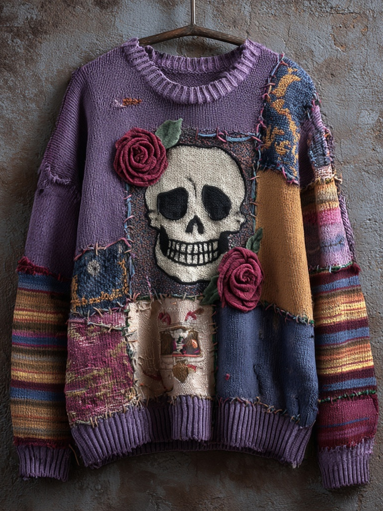 Vintage Skull & Roses Embroidered Patchwork Knitted Sweater