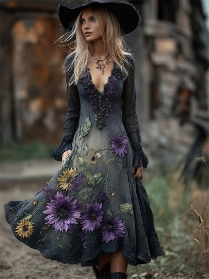 Vintage Sunflowers Lace V Neck Dyed Flowy Linen Dress