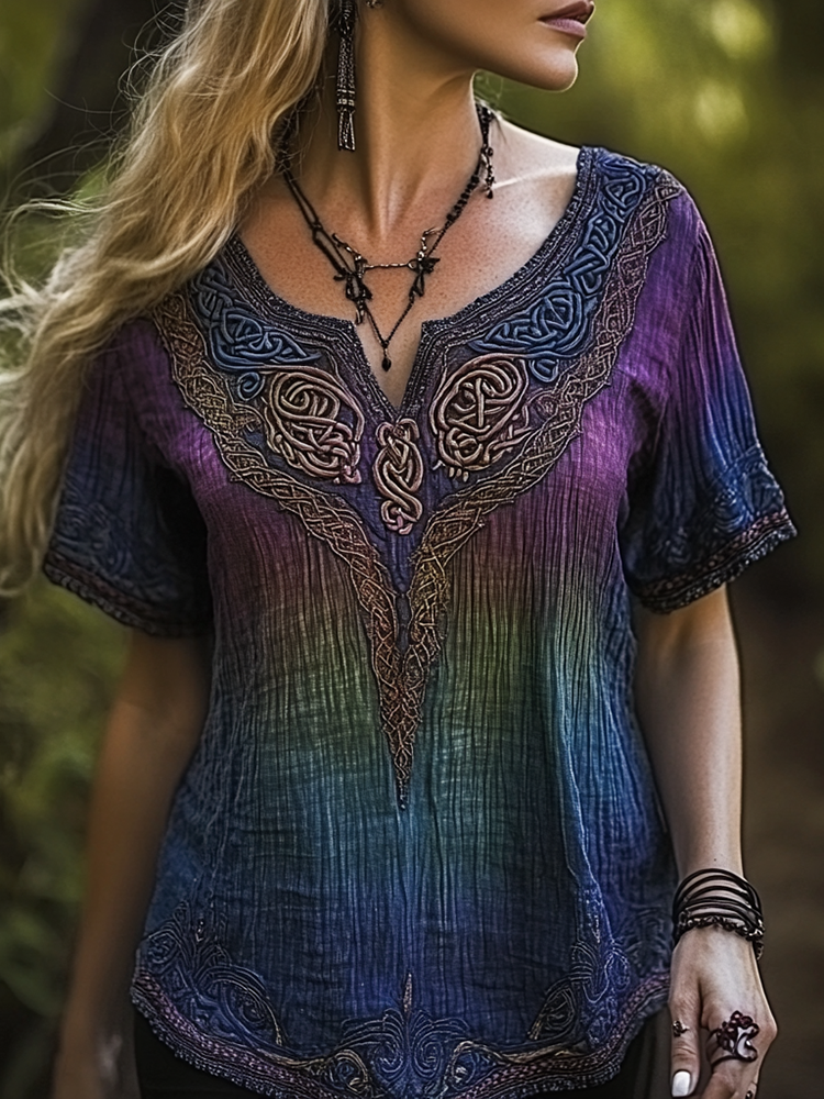 Vintage Viking Celtic Knot Embroidery Gradient Art Linen Shirt