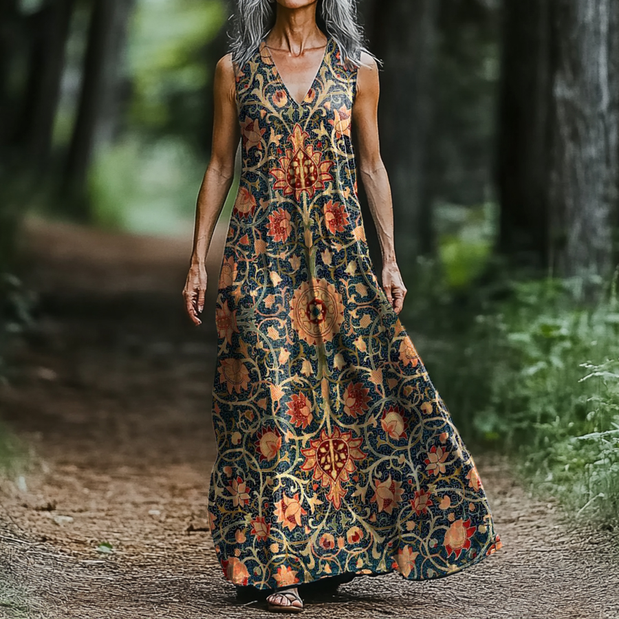 Women's Ethnic Totem Floral Art Pattern Print V-neck Sleeveless Pocket Cotton Dress