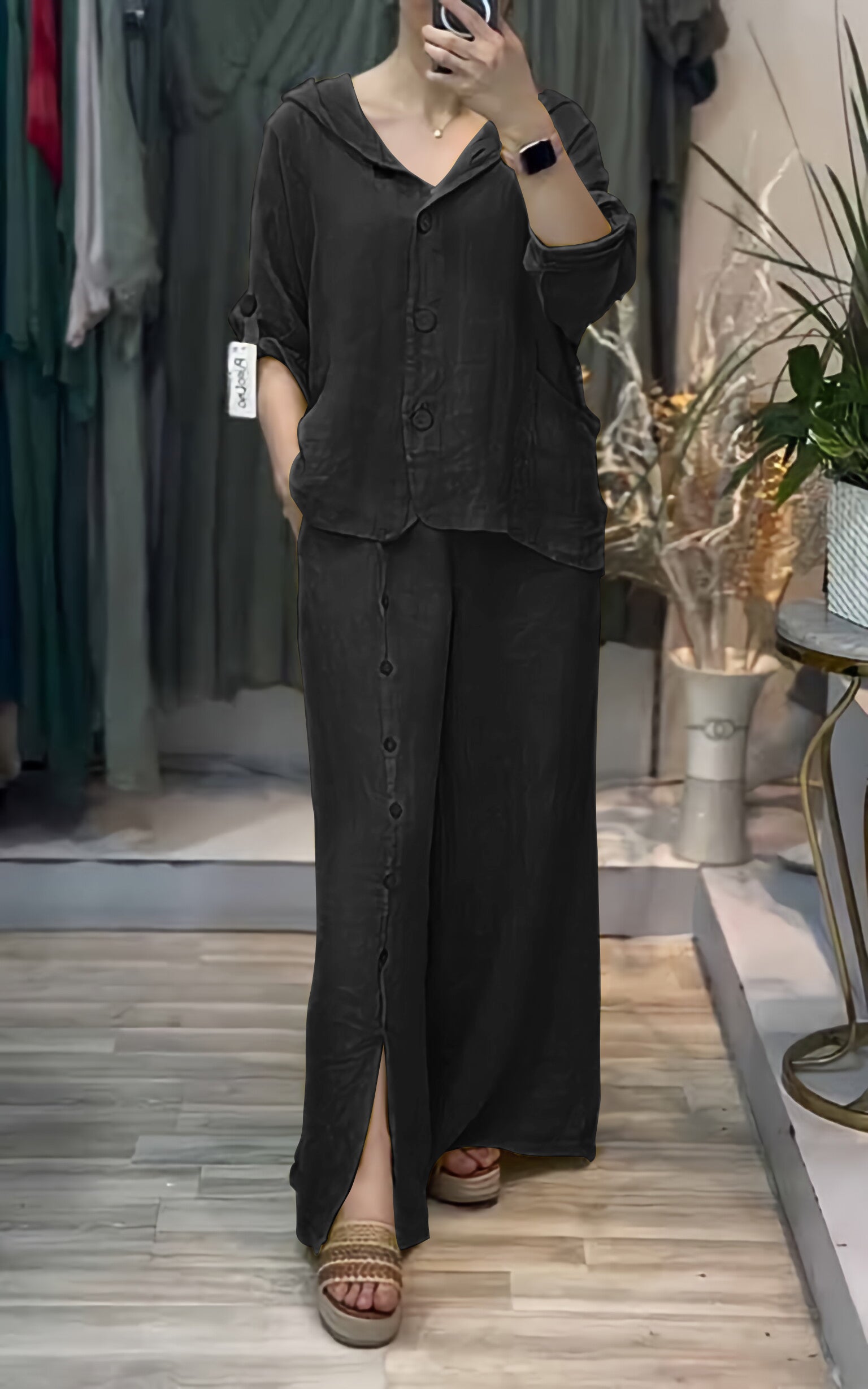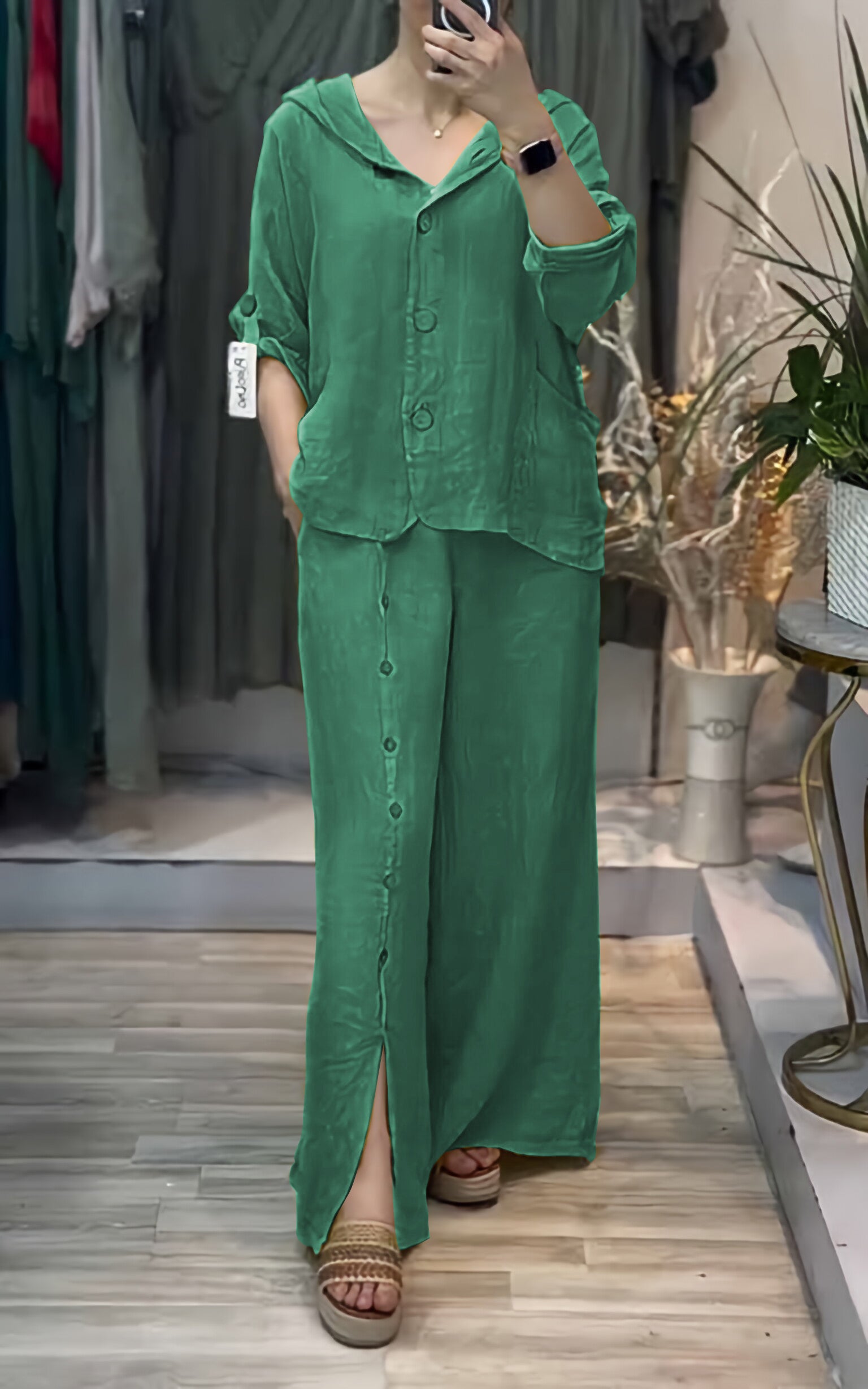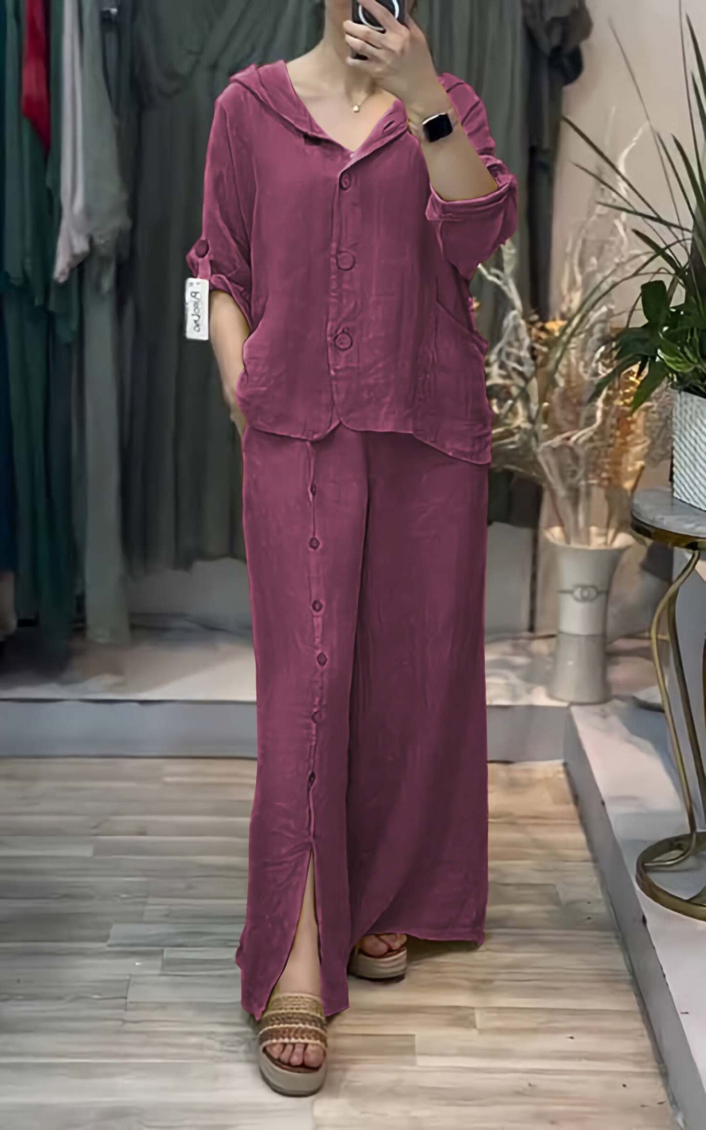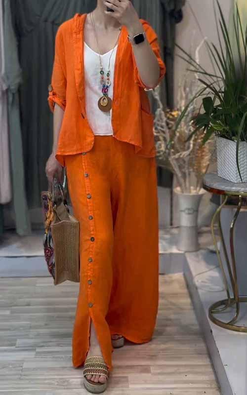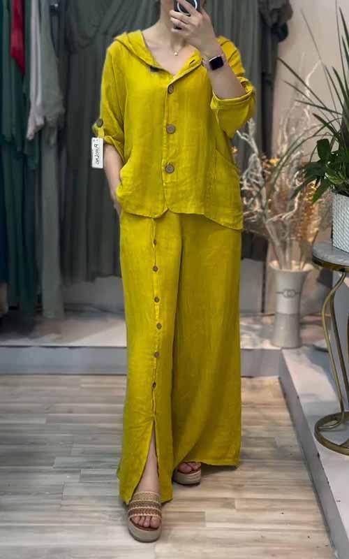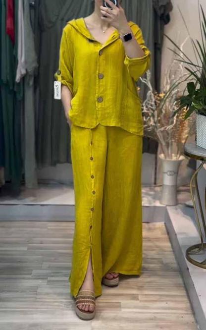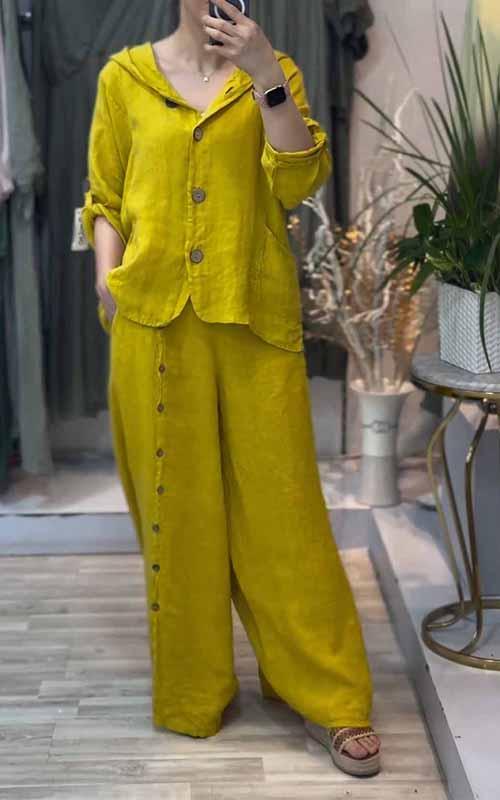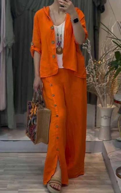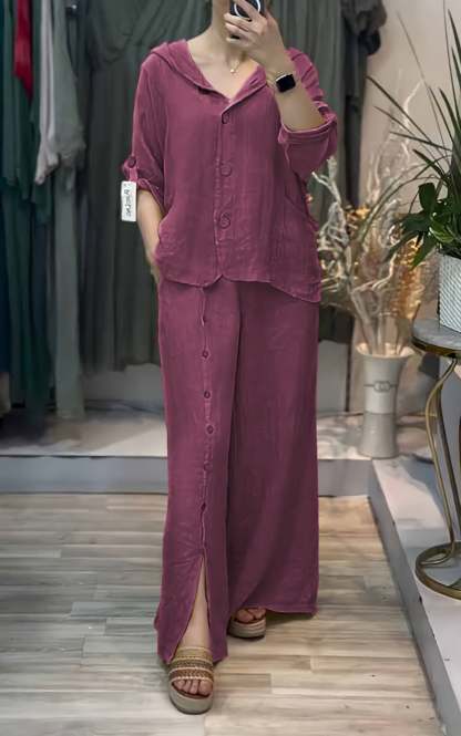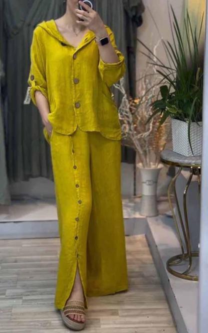 Women's Hooded Solid Color Cotton and Linen Two-piece Suit