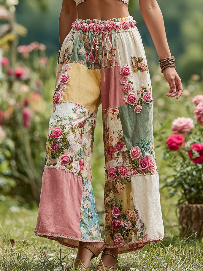Women's Rose Floral Patchwork Waist Elastic Pocket Pants