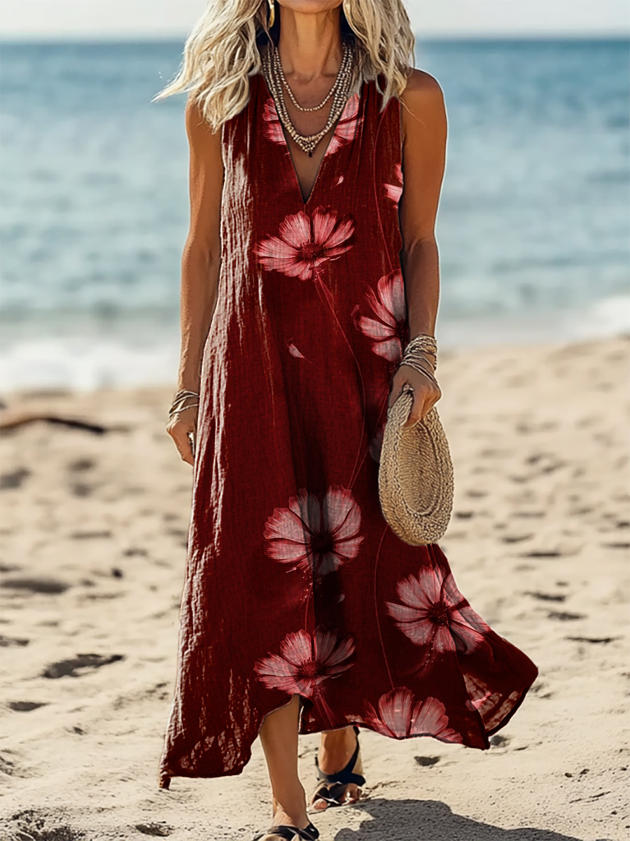 Women's Vintage Floral Art Print Pocket Cotton Dress