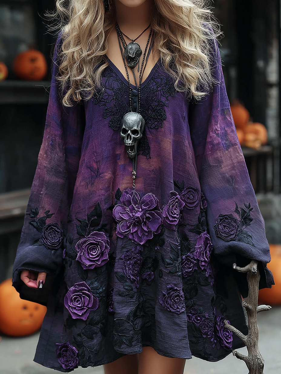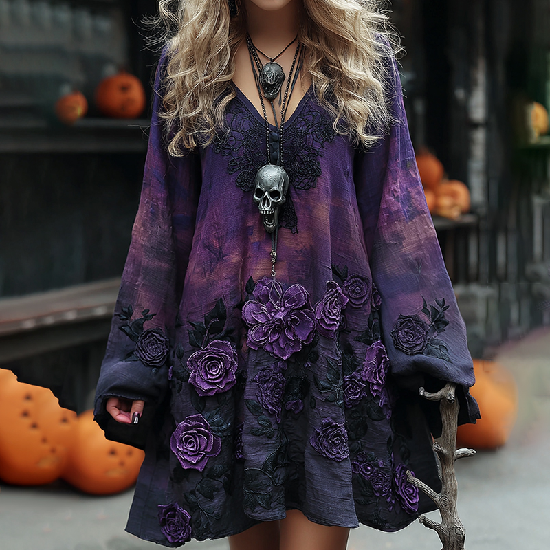 Women's Vintage Halloween Purple Rose Art Comfy Linen Mini Dress