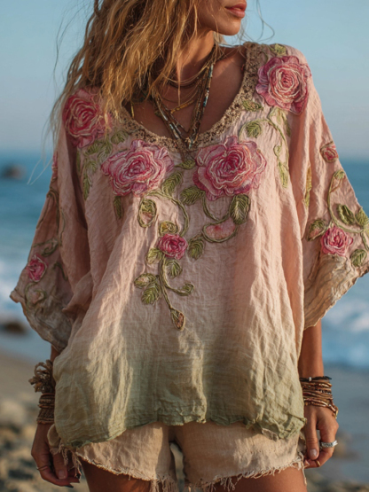 Women's Vintage Rose Gradient Art V Neck Linen Comfy T-shirt