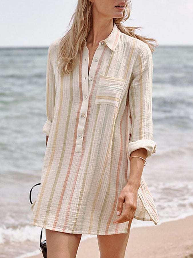 Women'S Casual Lapel Long Sleeve Striped Print Button Shirt Dress
