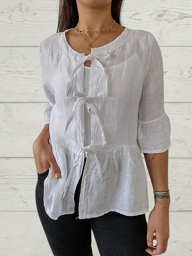 Women's Casual Solid Color Bow Tie Mid Sleeve Shirt
