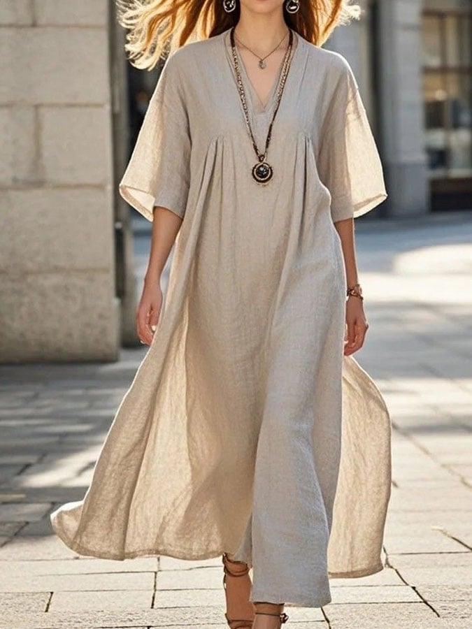 Women'S Casual Solid Color V-Neck Three-Quarter Sleeve Loose Dress