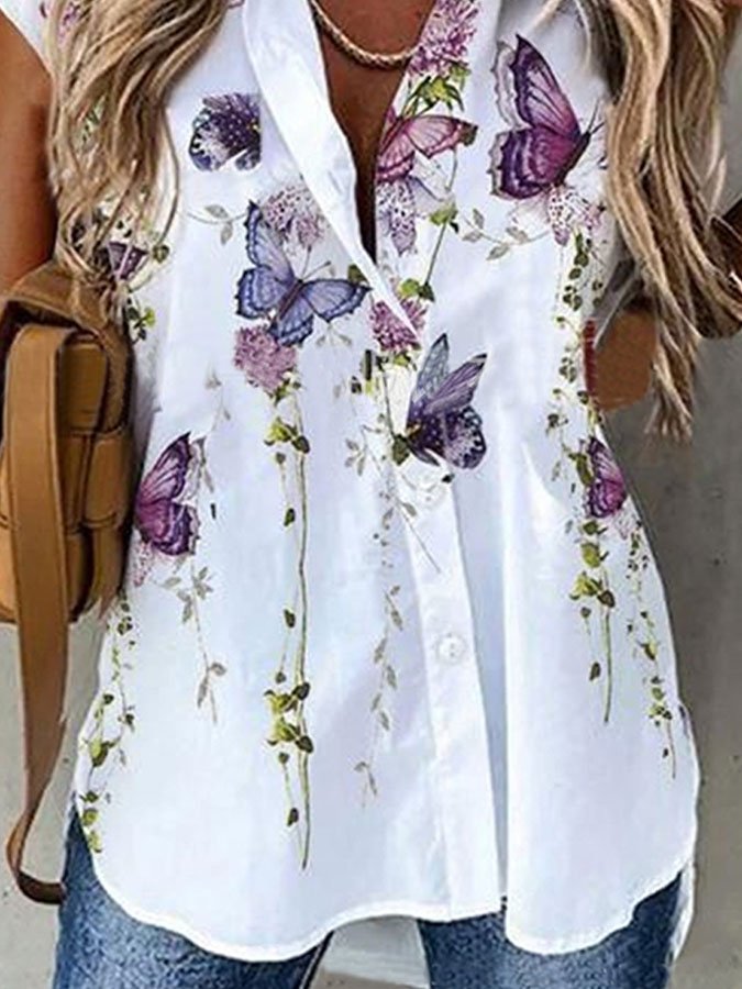 Butterfly Floral Print Short Sleeve Lapel Shirt
