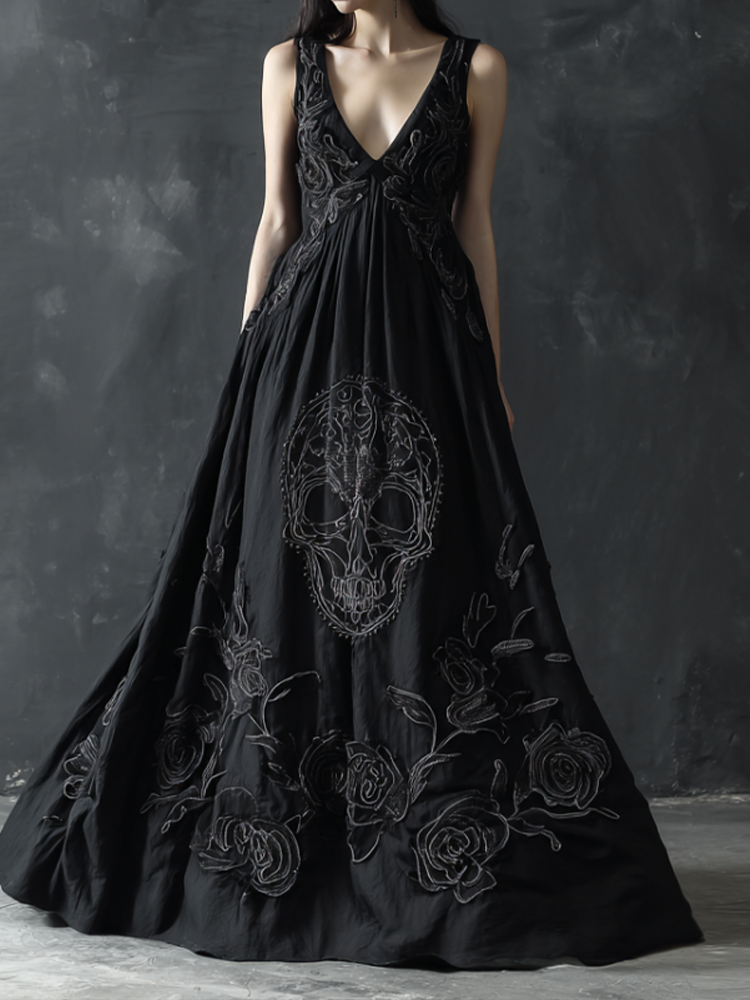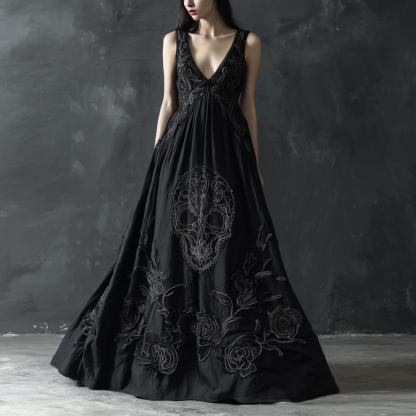 Halloween Gothic Skull Pattern Women's V-neck Long Dress