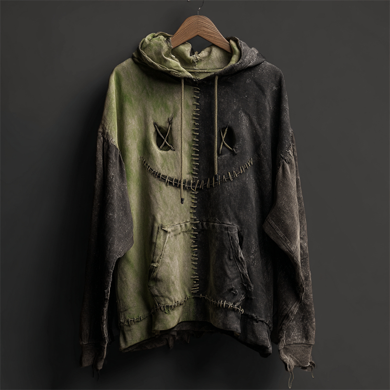 Halloween Monster Face Contrast Patchwork Washed Hoodie