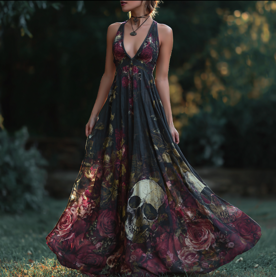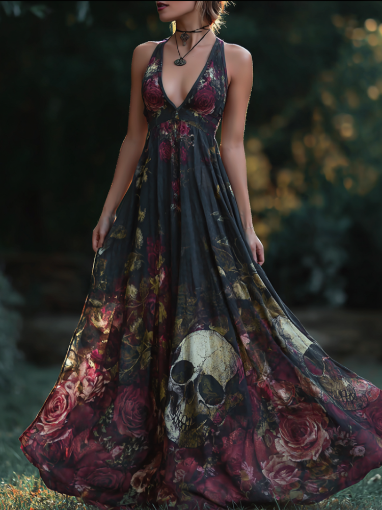 Halloween Theme Rose And Skull Pattern Women's V-neck Long Dress