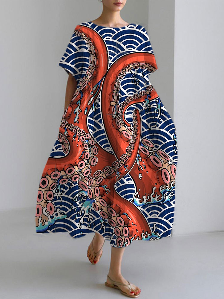 Japanese Art Ocean Octopus Print Cotton Blend Dress