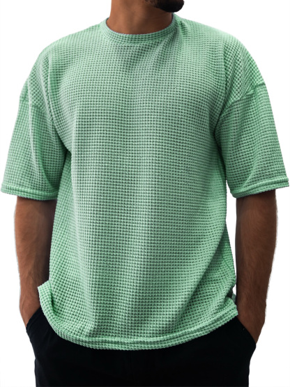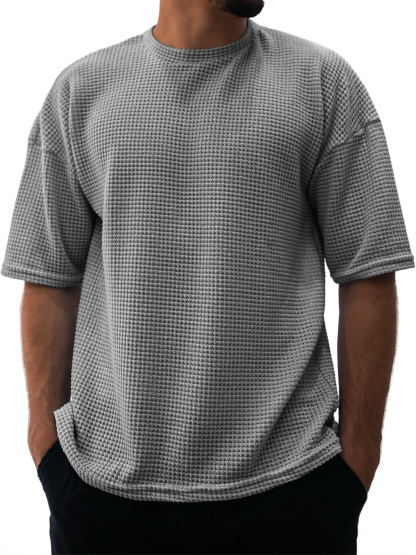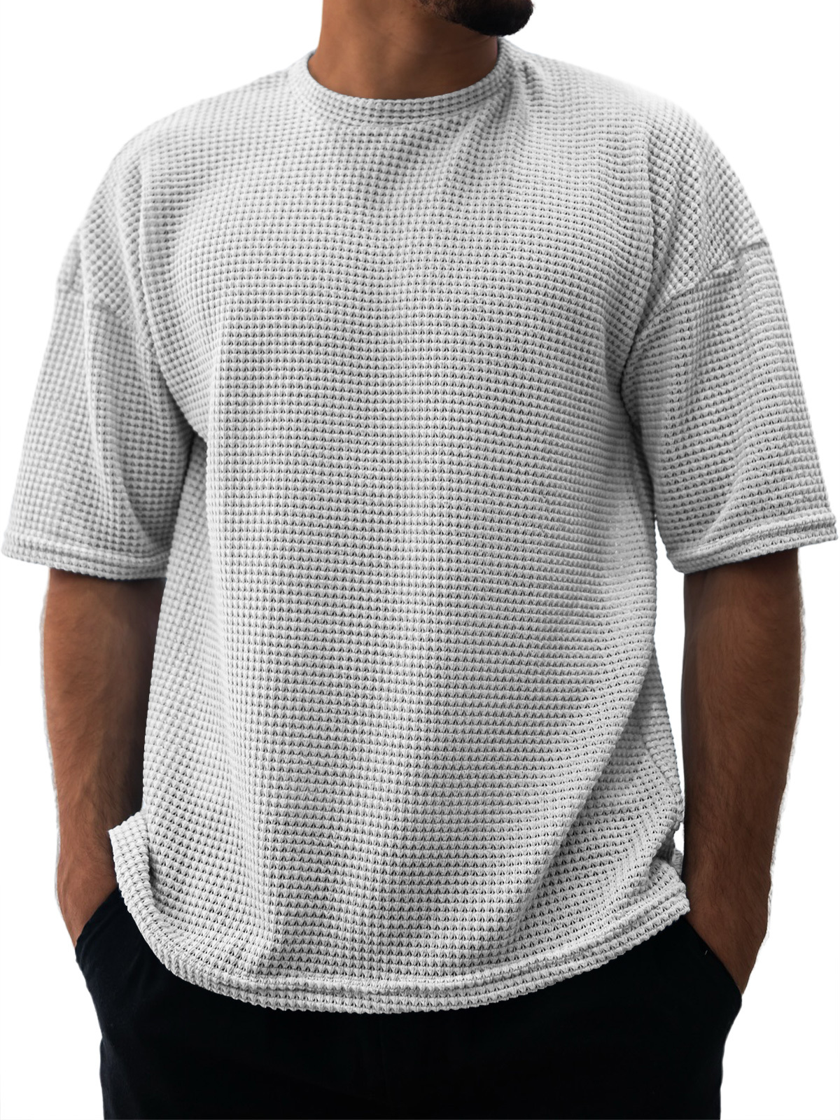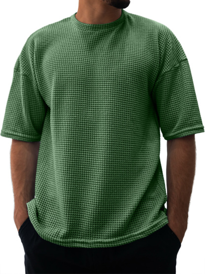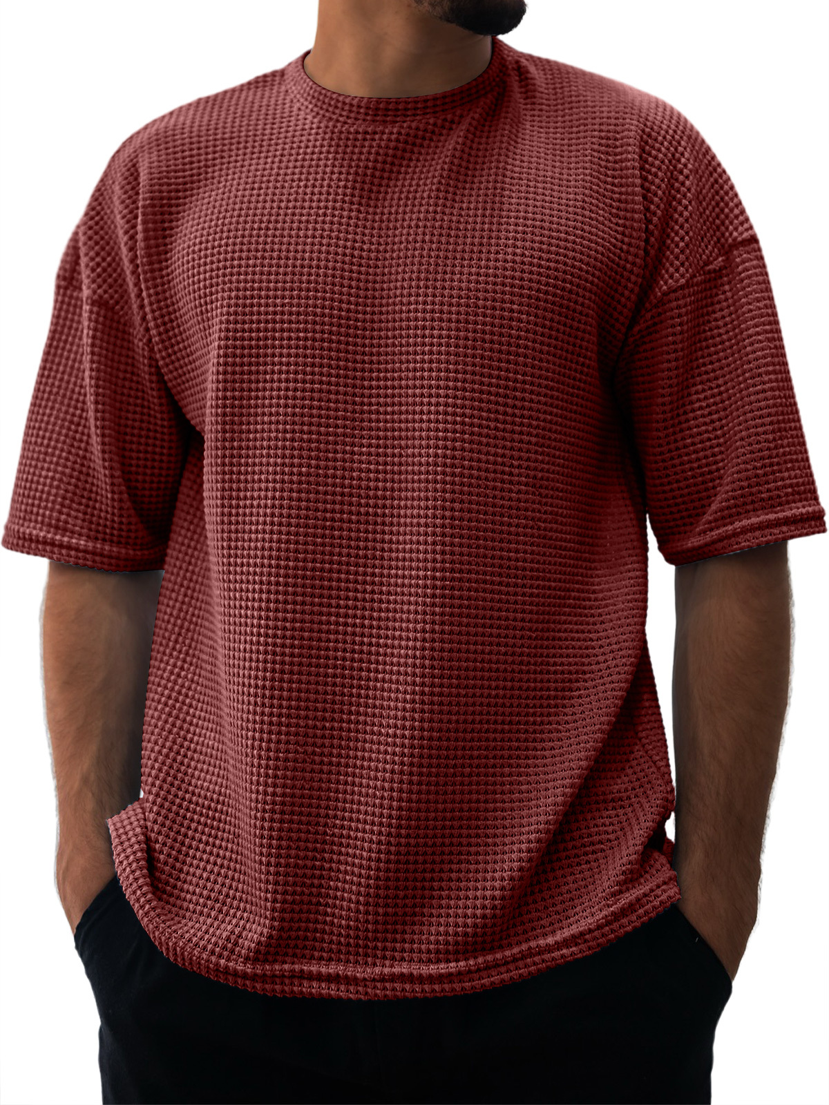 Men's Round Neck Casual Waffle Texture Solid Color Short-sleeved T-shirt