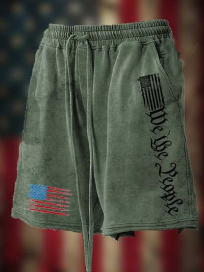 Men's Vintage Distressed Hem Independence Day Print Loose Shorts