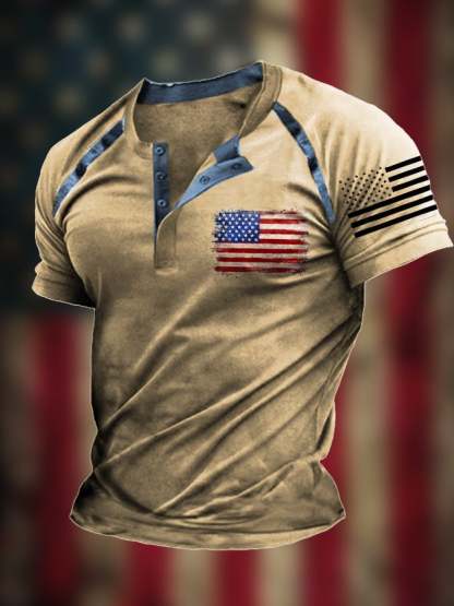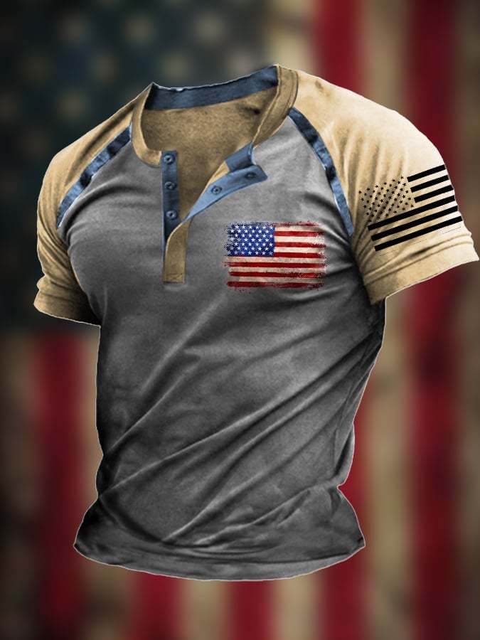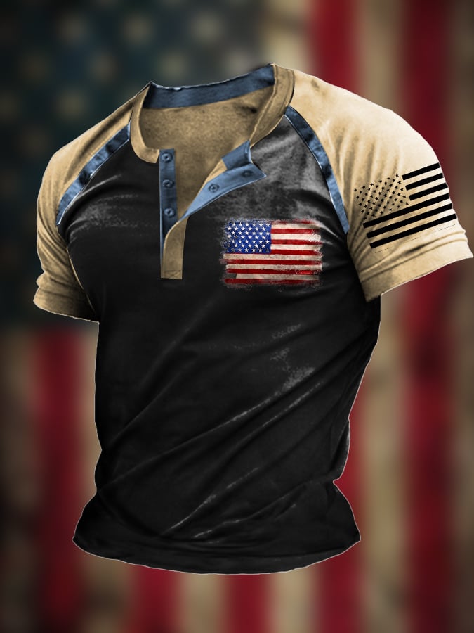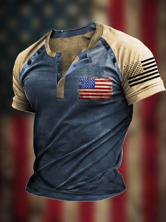 Men's Vintage Patchwork Flag Independence Day Henley Neck T-Shirt