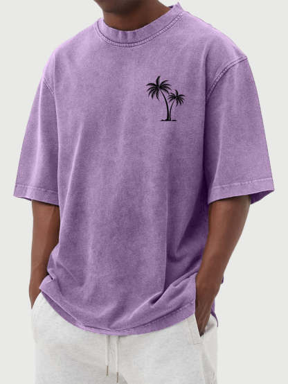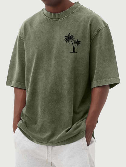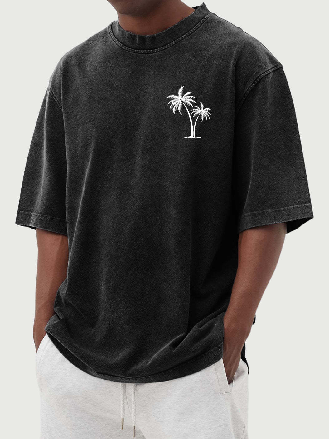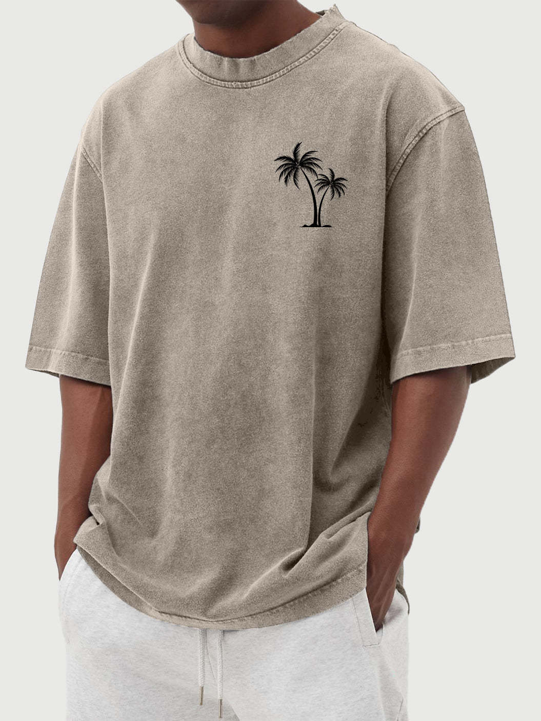 Men's Vintage Washed Palm Tree Print Short Sleeved Round Neck T-shirt