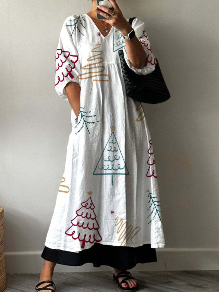 Simple Line Drawing Christmas Tree Decoration Pattern Pocket V-neck Cotton Dress