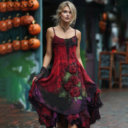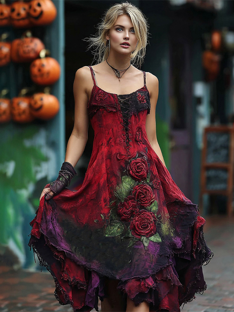 Vintage Red Rose Embroidery Beaded Gradient Halloween Maxi Dress