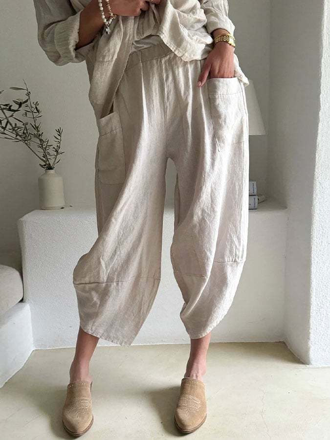 Women's Casual Solid Color Pocket Cotton and Linen Cropped Pants