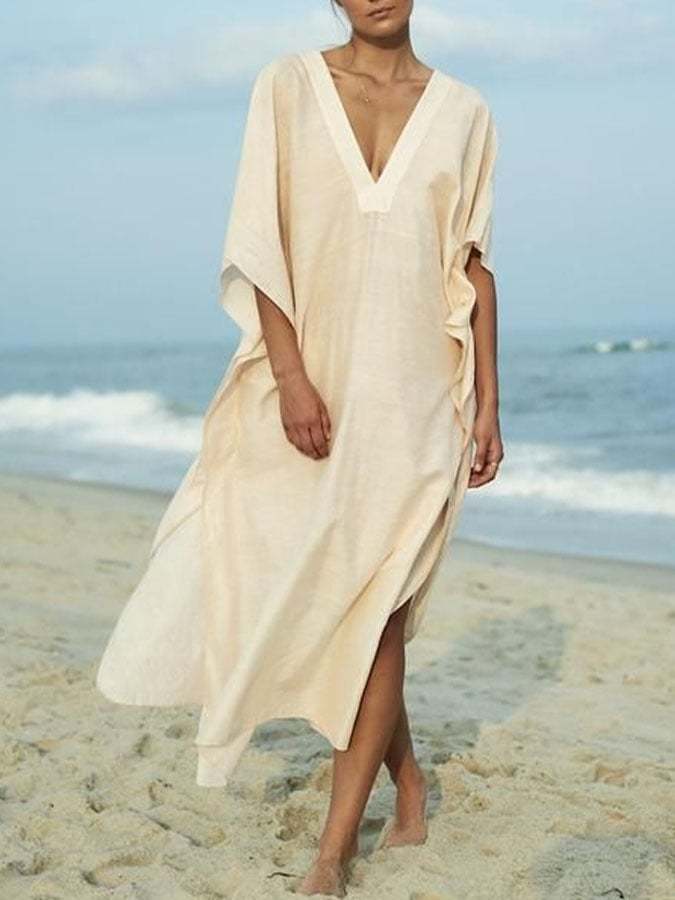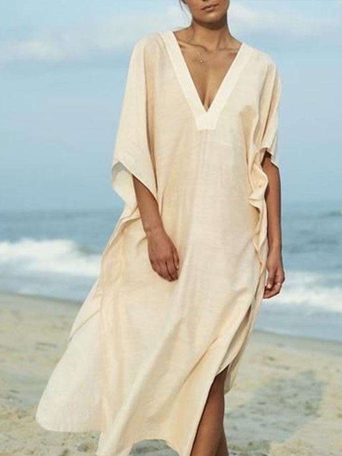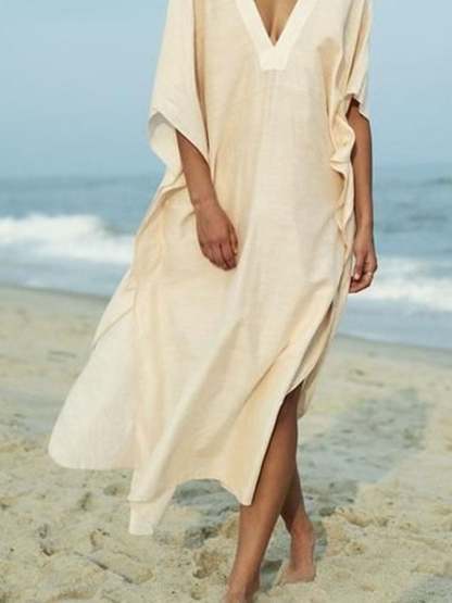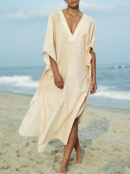 Women'S Casual Solid Color V-Neck Three-Quarter Sleeve Loose Dress