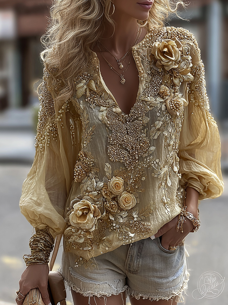 Women's Classic Bohemian Yellow Floral And Gold Roses Embroidery Art Linen Blend Half-collar T-shirt
