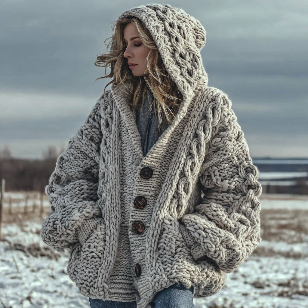 Women's Fair Isle Chunky Knit Warm Button-down Hooded Cardigan