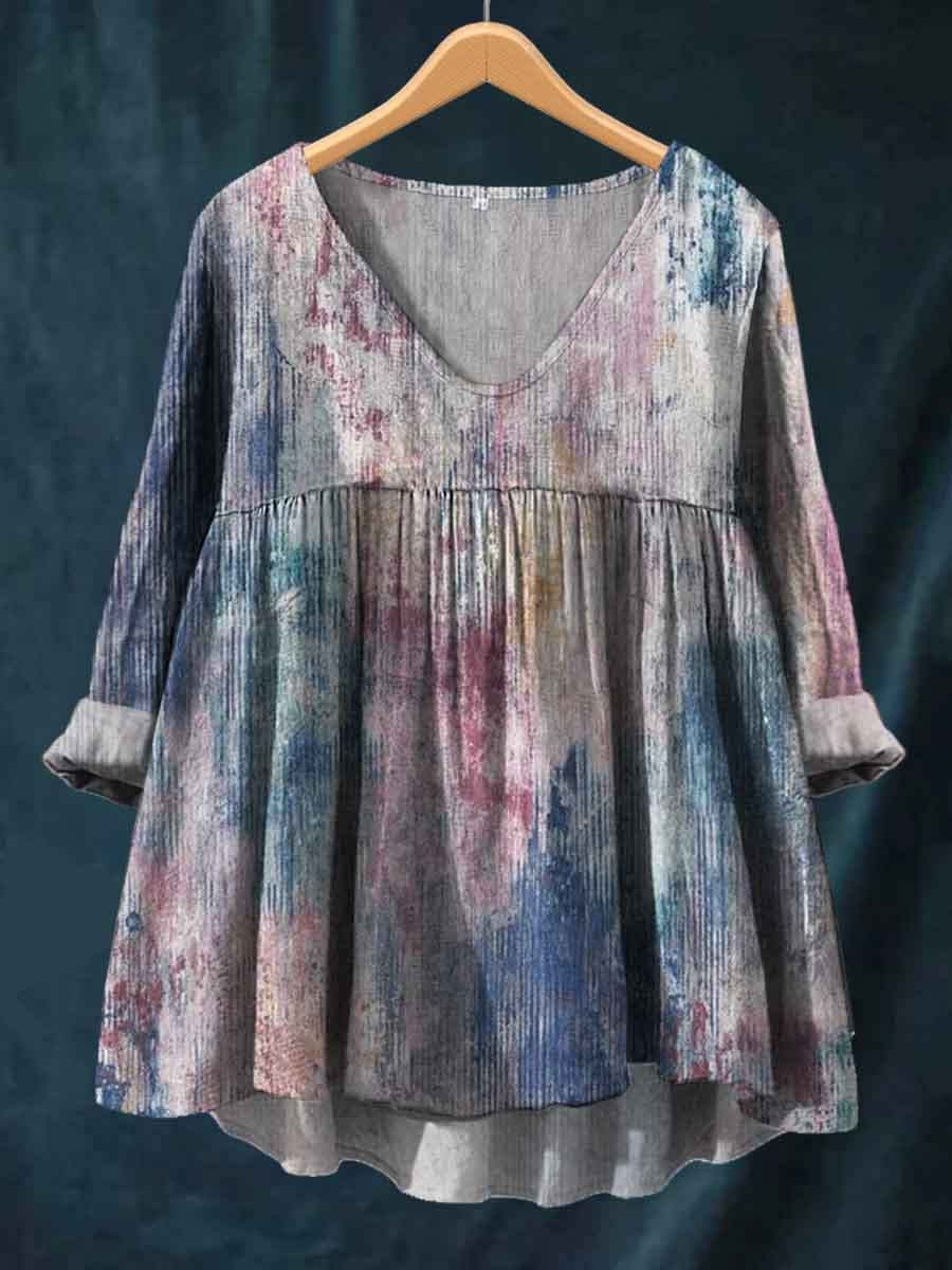 Women's V-neck Tie-Dye Printed Pleated Casual Comfort Cotton Shirt