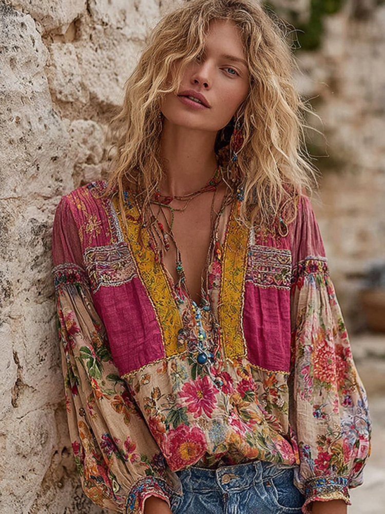 Women's Vintage Bohemian Floral Embroidery Art V-neck Long Sleeve Linen Blend T-shirt