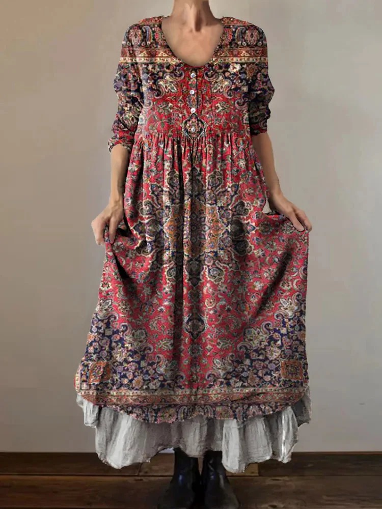 Women's Vintage Ethnic Totem Art Print V-Neck Button Pocket Cotton Dress