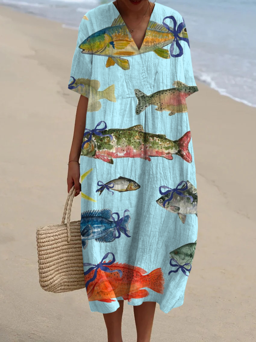 Women's Vintage Fish Art Print Flowy Dress