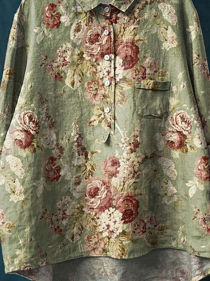 Women's Vintage Floral Art Print Casual Cotton And Linen Shirt