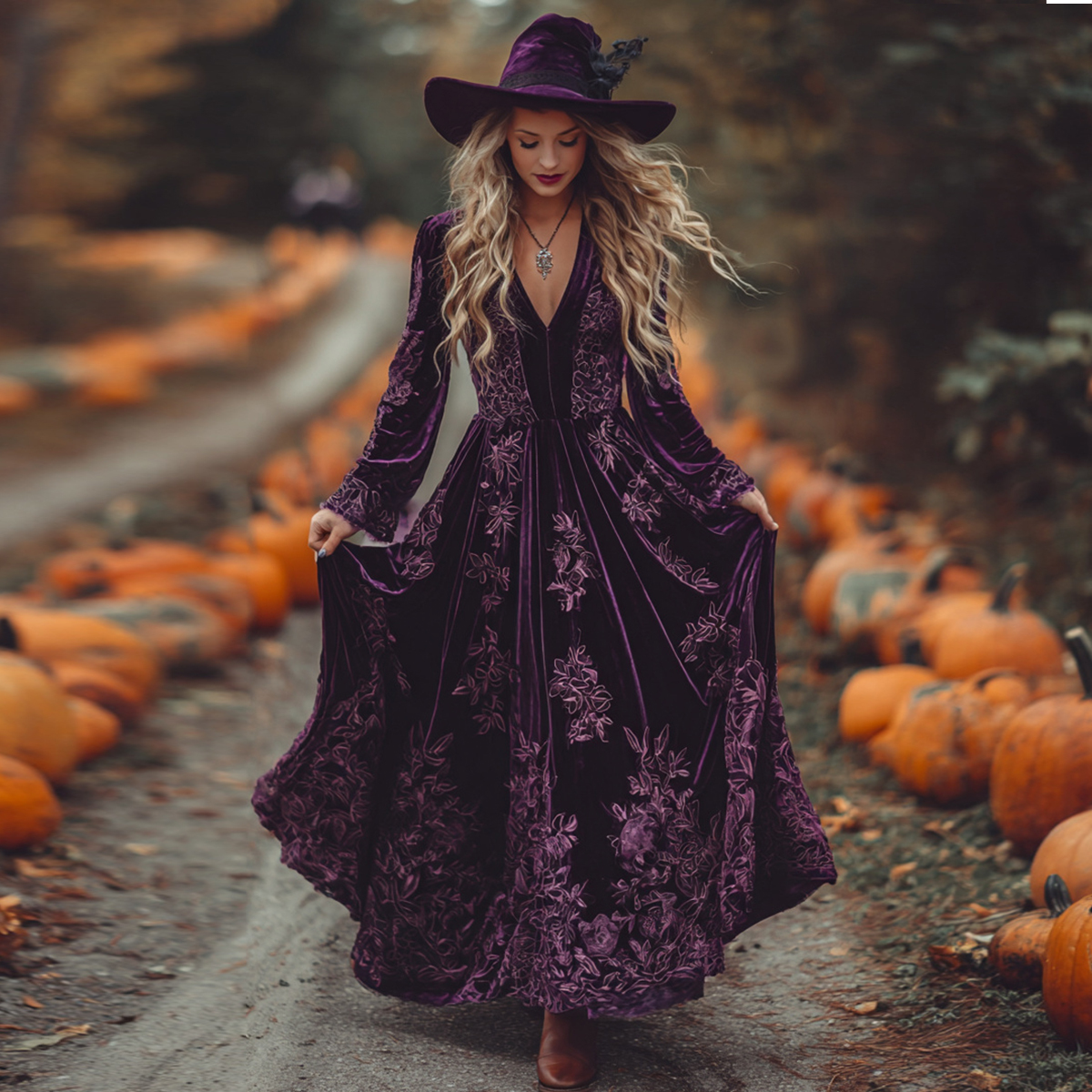 Women's Vintage Halloween Floral Art Comfy Velvet Maxi Dress