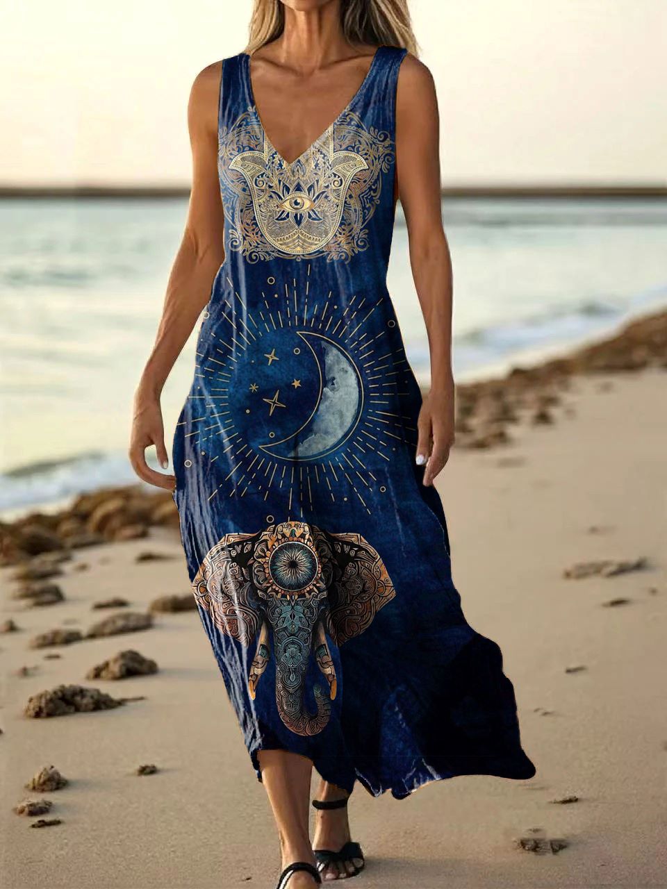 Women's Vintage Moon Elephant Tattoo Pattern Art Print Pocket Cotton Dresses